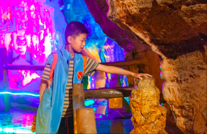 “小朋友们,你们知道吗?这些钟乳石可是经历了亿万年的时光才形成的,它们每百年才生长一厘米呢!”工作人员话音刚落,一个小女孩便瞪大眼睛,满脸惊讶地喊道:“哇!原来石头也会‘长大’。”孩子们纷纷围拢在钟乳石旁,踮起脚尖,仔细观察着这些形态各异的"石头精灵"。